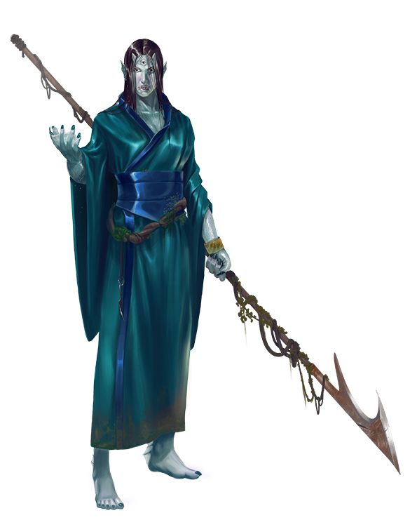 Among the most powerful yai are those who emulate the form of storm giants. Rather than lord over their giant-kin like most oni, though, water yai prefer to lurk alone in the world's oceans (or, much more rarely, large and remote freshwater lakes). When a water yai must interact with mortals beneath the waves, they prefer to do so while disguised as a storm giant. Water yai pursue the acquisition of material wealth and riches above all other interests, garbing themselves in richly colored, magically waterproofed kimonos and adorning their monstrous faces with all manner of jewelry. These yai can infuse their kimonos with eerie magical properties, and in combat, they can also fire bolts of electricity from their third eye.
