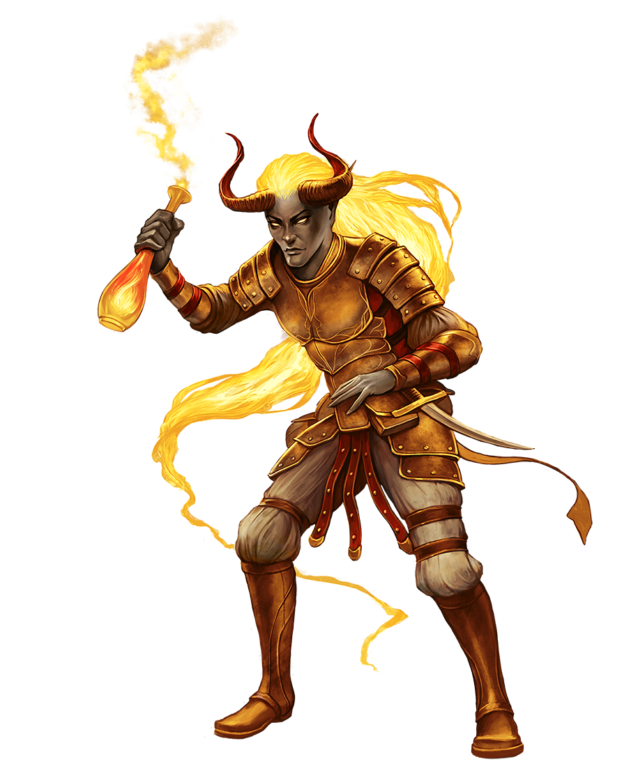 Ifrits' blood blazes with elemental fire. Most ifrits are second-class citizens who serve under the iron heel of the efreeti and their Dominion of Flame, but those born outside the efreet hierarchy or who choose to flee it live lives of passion in search of fame, glory, and power.