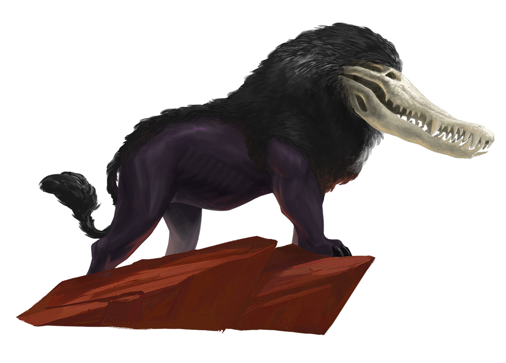 Esoboks are brute hunters and pugnacious sentinels that serve as the guard dogs of the Boneyard. These squat, powerful quadrupeds have a frill of dark feathers around their distinctive heads which resemble a crocodile skull. Esoboks rarely bother with those who are truly dead, allowing the dead of the Boneyard to go about their business while remaining watchful for danger. Though cunning when sniffing out threats to the Boneyard or to their psychopomp handlers, they're among the least intelligent of the psychopomps and rarely speak except to utter growling threats. The wise listen when an esobok makes a threat, as it won't do so twice.