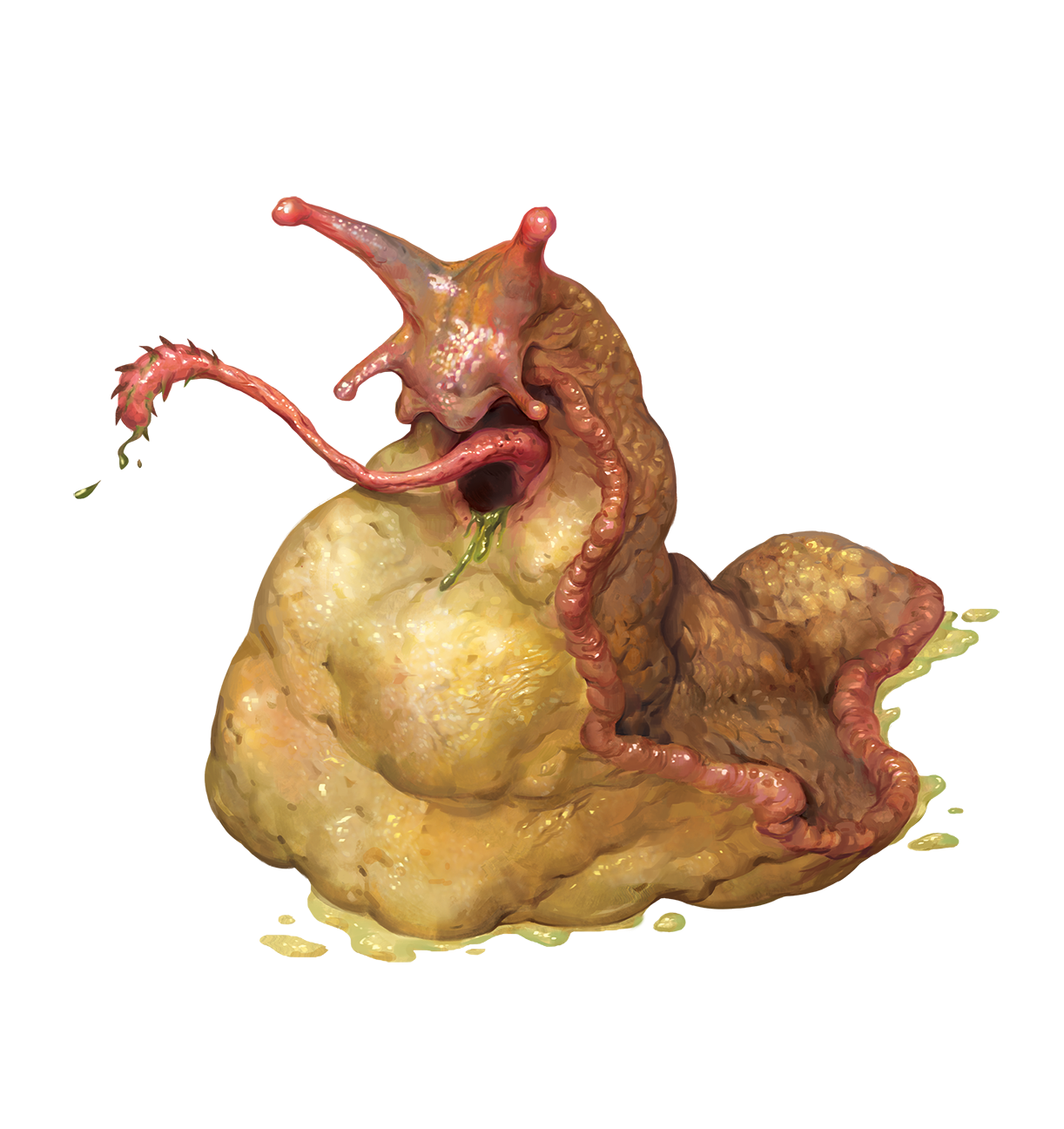 These massive, primeval relatives of ordinary slugs squirm slowly through swamps and grasslands. Giant slugs are always voracious and prefer to eat flesh or plants high in water content. They frequently consume livestock or strip bare entire orchards or melon crops. For cattle, pigs, or other sizable meals, they first shred the creatures using their radula—tongue-like appendages covered in teeth— to make them easier to consume. The mucus secreted by a giant slug is powerfully acidic and viscous. Wherever it travels, the creature leaves a trailing brown strip that kills most vegetation. Farmers and ranchers, especially those living near swamps known to contain giant slugs, keep close tabs on these journeys. Many almanacs go into great detail on slug migration and mating seasons. Since each giant slug needs its own wide hunting ground, the creatures typically come into proximity to mate only once a year. Either or both slugs can become impregnated, and any that do typically lay a clutch of around 100 eggs. They usually lay these eggs in a shallow bog or a cool, humid cave.