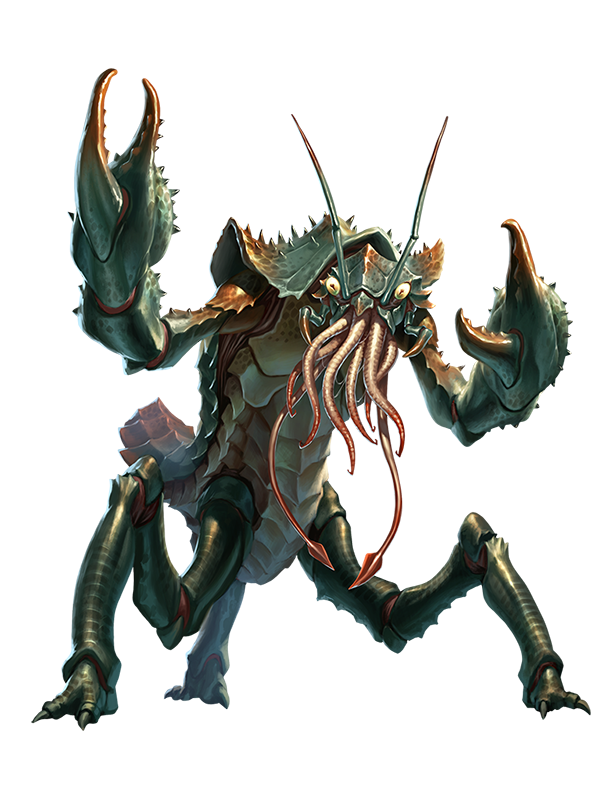 Also known as chu'ulothis, these large, armor-plated, crustacean predators lurk beneath the surface of pools, mires, and ponds, waiting to snatch up prey with their massive claws before paralyzing them with their tentacles. At that point, they begin to feed, eating their quarry alive.