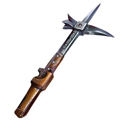 The long hammer features a pronged hammer head designed for damaging knees and ankles, counterbalanced by a stout spike and affixed to a reinforced shaft between 5 and 7 feet long.