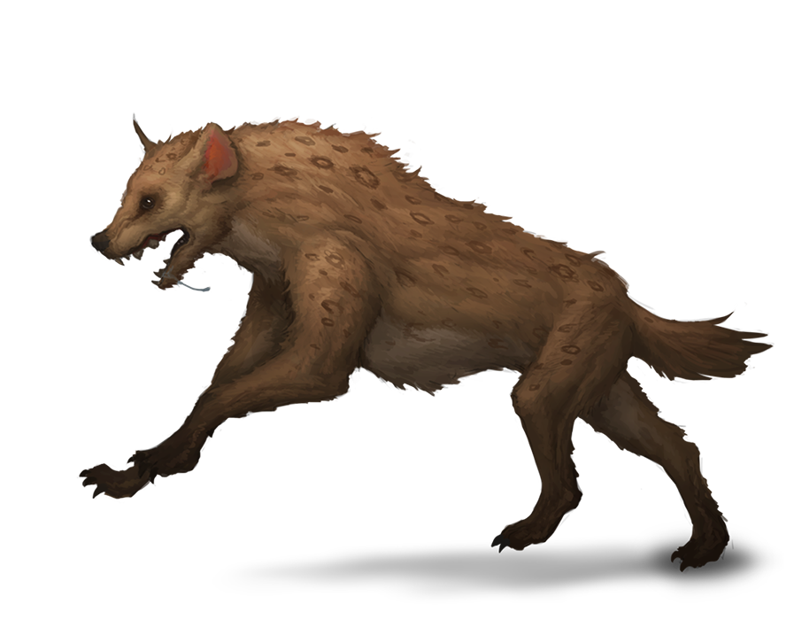The hyena’s intense cunning, combined with its unnerving laughter, has caused hyenas to become associated with all manner of evil—hyenas are claimed to rob graves, steal children, and wield sinister supernatural powers. Though normal hyenas are no more malicious than any other natural predator, their unearned reputation often causes witches, warlords, and ill-natured creatures to seek out hyenas as pets or guard animals. The fact that gnolls in particular have a special preference for hyenas, considering the animals to be close relatives, does little to improve the animal’s already-poor reputation.