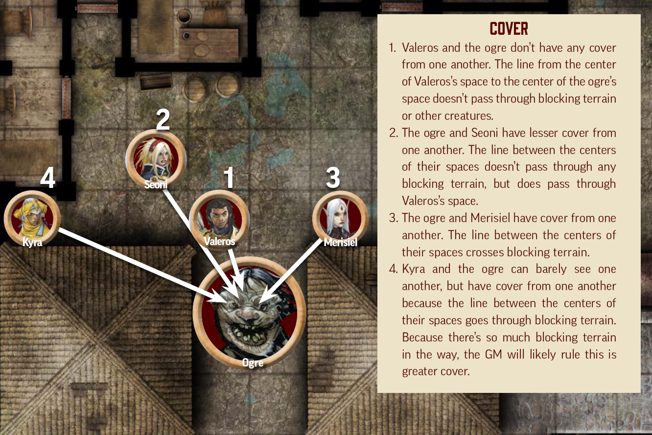 Creatures can get tactical advantages by careful positioning. The most common are using cover from terrain and other creatures to increase your AC, and flanking, which requires you and an ally to be on the opposite sides of an enemy to reduce the enemy's AC.