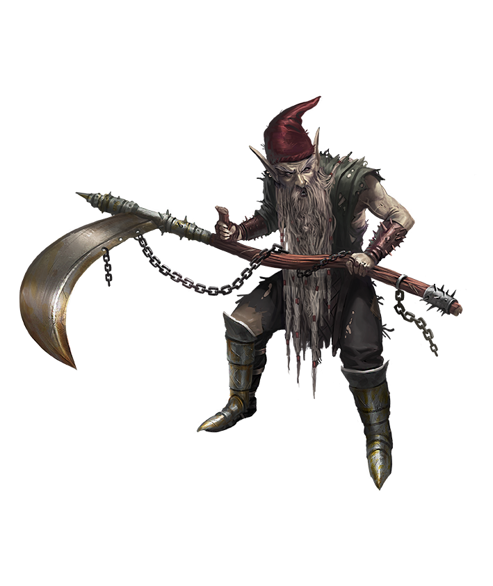 Redcaps are sadistic and capricious fey who thrill in bloodletting and murder. While they are most famous for appearing as wizened, bearded men, redcaps of other genders are no less fearsome or cruel. However, redcaps are ultimately craven bullies, cowed by anything more powerful than themselves, a trait that leads them to fear and despise the symbols of deities.