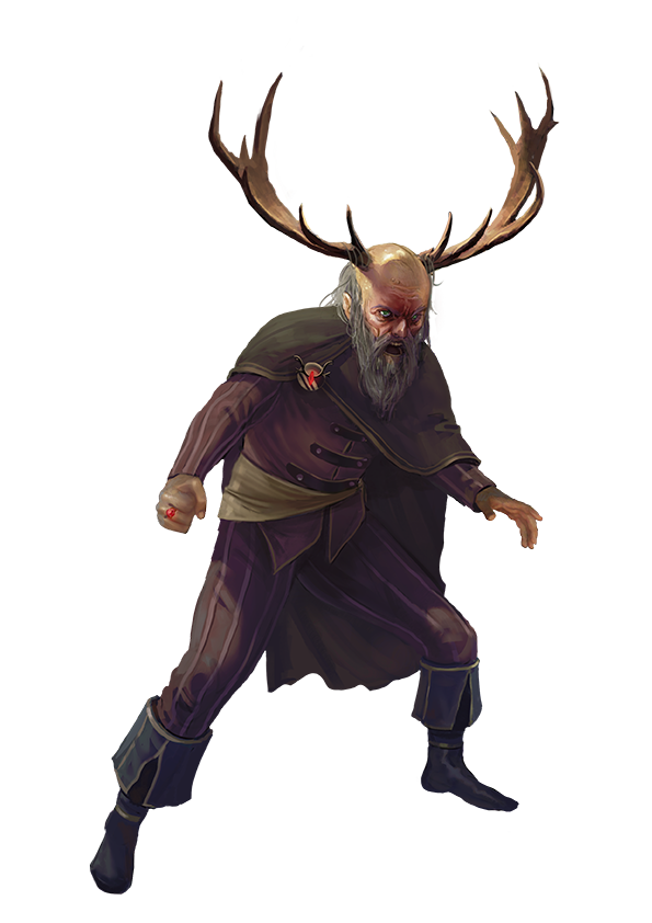 Rage-filled skelms are drawn to any settlement with more than a few hundred souls. Using magical disguises and leveraging societal norms to their benefit, these antlered monsters crave fearful respect and brutally punish any who dare disagree with their lofty opinions, even in the slightest degree. Although quite dangerous on their own, skelms are at their deadliest when leading an angry mob. Their cruel and exploitative nature has made their name synonymous with villainy.