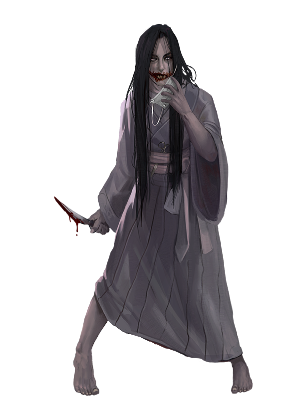 A kuchisake-onna, or slit-mouthed woman, is a tall, masked figure who moves with an eerie grace. These horrors are infamous for trapping hapless mortals and asking them, “Am I pretty?” A “no” response leads to a gruesome death wrought by the silver scissors the kuchisake-onna carries. A “yes” prompts them to remove their mask, revealing the scars and cuts running from ear to ear, giving the impression of a terrible, ever-present grin. They then open their mouth to reveal sharp, needle-like teeth and ask another question: “Even now?” A “no” leads to the same gory death, while a “yes” prompts them to use their silver scissors and make the same cuts on the target's face while repeating: “Then I will make you like me.”