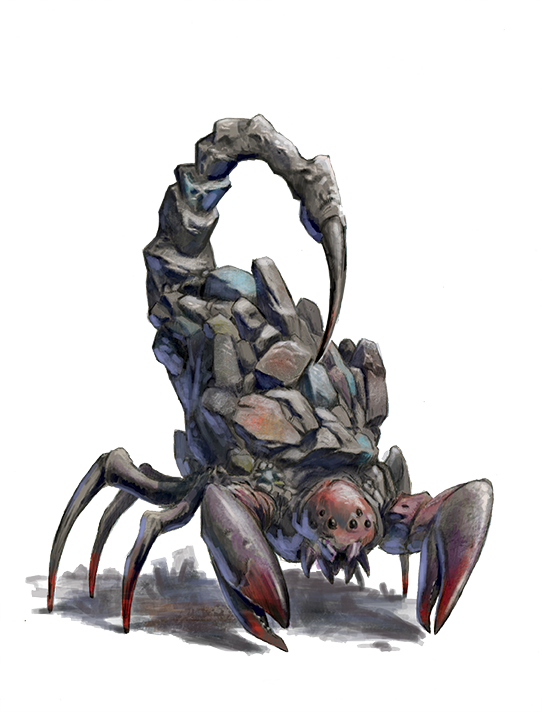 Chitinous scourges of deserts, forests, savannas, and badlands, scorpions are deadly arachnids with powerful pincers and a painful sting. Scorpions can be found in nearly every climate, where they hunt their prey with a mixture of patient stealth and raw strength. Most scorpions live in underground burrows, either as lone hunters or part of a larger colony. These arachnids are so feared and dangerous that in many cultures, they are treated as deities or dualistic symbols of both death and protection from said death.