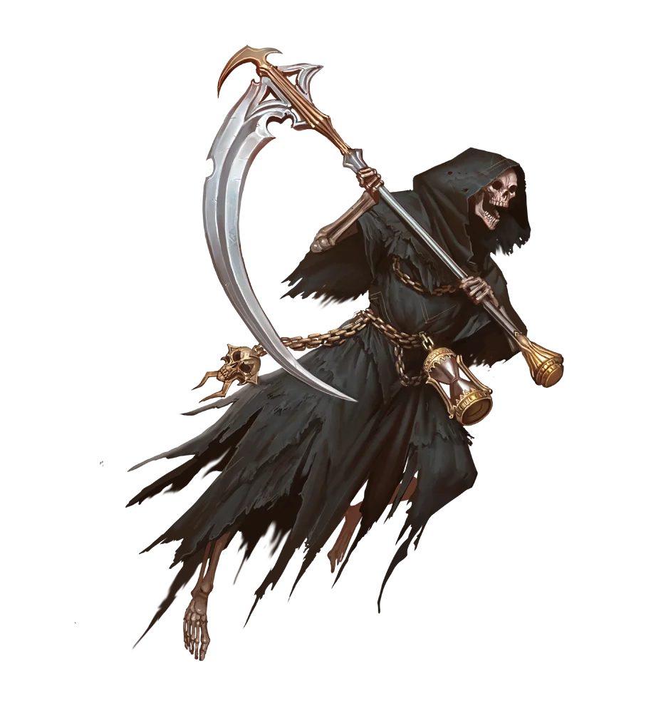 The Grim Reaper is the unflinching personification of death. Silent as the grave and inexorable as time itself, this legendary being hunts down creatures that have evaded death for too long. Sometimes the Grim Reaper comes without warning. Other times it comes to finish the work others could not. The Grim Reaper serves no god, fiend, aeon, or otherworldly being. It's both despised and feared by psychopomps and celestials, but few—if any—dare stand in its way. Like some eternal plague, it kills any who try to cure the multiverse of its presence. It stands alone and keeps its own council. The pleas of mortals and immortals alike fall on deaf ears once the Grim Reaper chooses its quarry. Its reasoning is silent and inscrutable to the mortal mind, but no matter its choice, the result is final.
