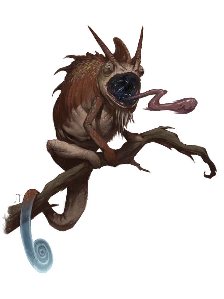 Rift chameleons are best known for their unsettling ability to swallow creatures significantly larger than themselves, thanks to a digestive tract that connects to its own pocket of the Ethereal Plane. When two or more rift chameleons remain in proximity for extended periods of time, their partially extradimensional nature begins to subtly warp the surrounding terrain. Direction and distance become confused to all but the lizards, making it easy for locals to get lost in places they once thought familiar.