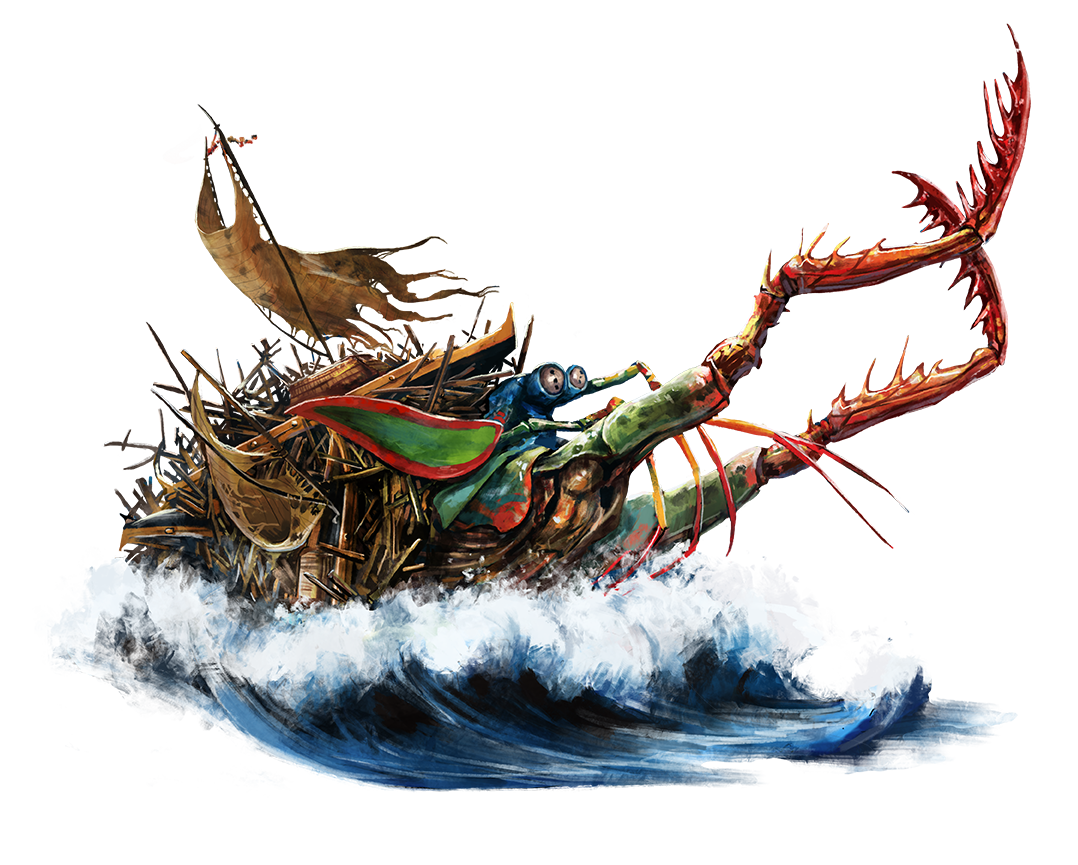 Though her current form is but a small and pale shell of her former glory, Tehialai is a legend even in her waning days. The titanic crustacean wears the hulls of ruined ships as her shell, ripped into shape by vessel-rending claws, as nothing else in Golarion's oceans is large enough to shield her body—or perhaps nothing else will satisfy her. Few ships can withstand her might, and fewer still are prepared for her appearance. Those who don't know of the thief of ships won't know to watch for her coming, and those who do know Tehialai offer her tribute to ward off her predation.