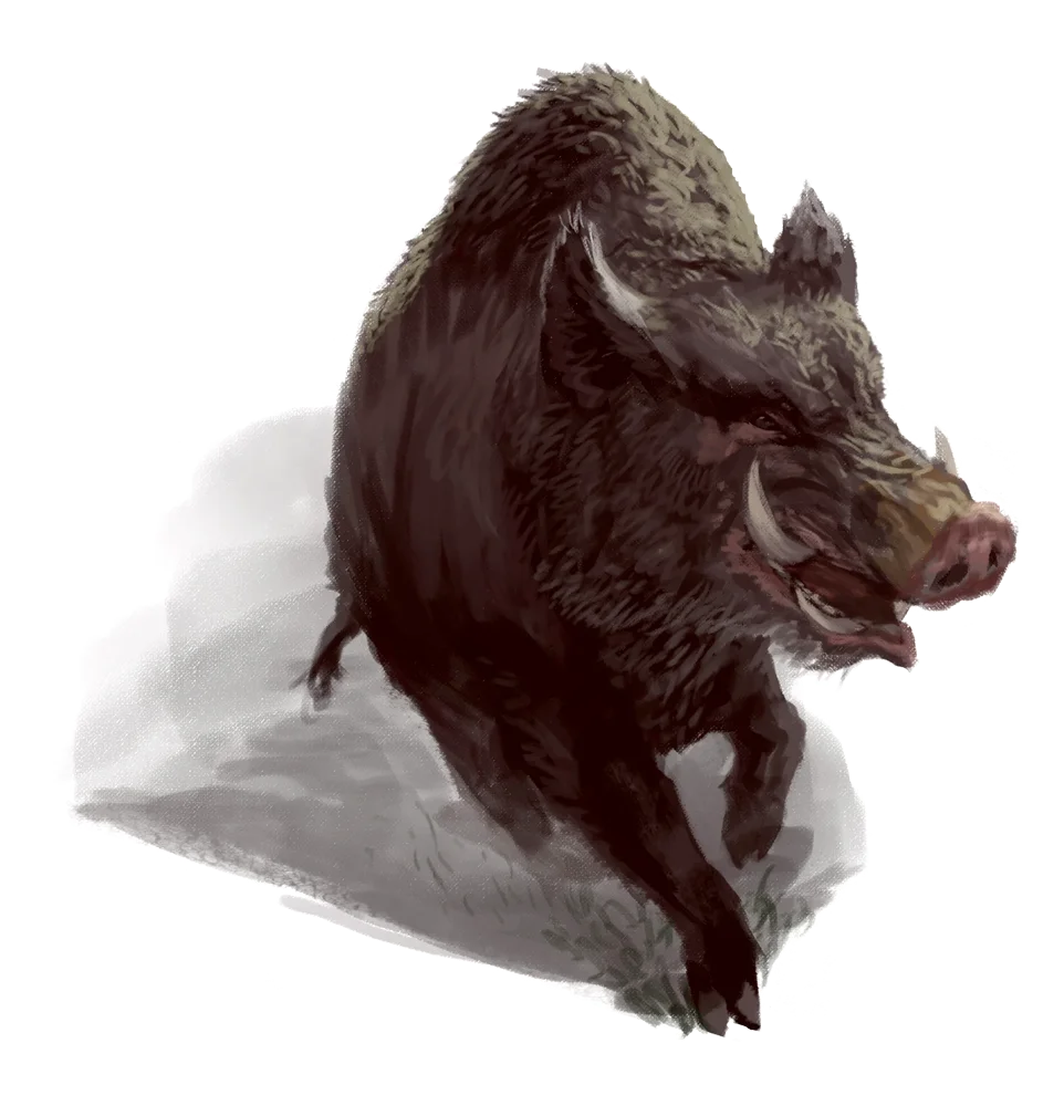 Boars are omnivorous mammals, hunted heavily because their meat is considered a delicacy. Boars are most likely to attack humanoids either in self-defense or during their mating season in the winter months, when the males grow an extra inch of tissue to protect their organs as they fight off rivals. Of course, in some cultures, boars are trained to become much more aggressive so they can fill the roles of warbeast and guardian. When such boars escape back into the wild, they can become true terrors in the region.
