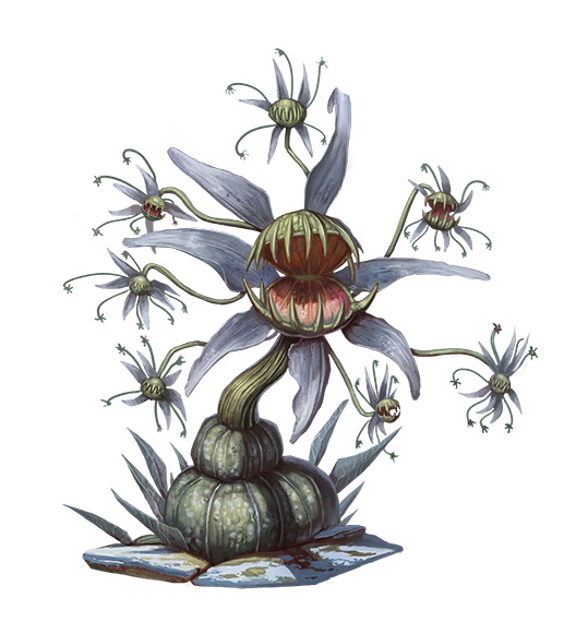 Dusk poppies sprout from spores that attach to carcasses, but they only blossom during the long twilight unique to the Crown of the World. The perfect conditions for their development are so rare that yaiafineti have developed a vigorous appetite. They feed unceasingly. Much of their energy goes to developing more polyps, and one plant can easily spawn a small infestation of these deadly bulbs.
