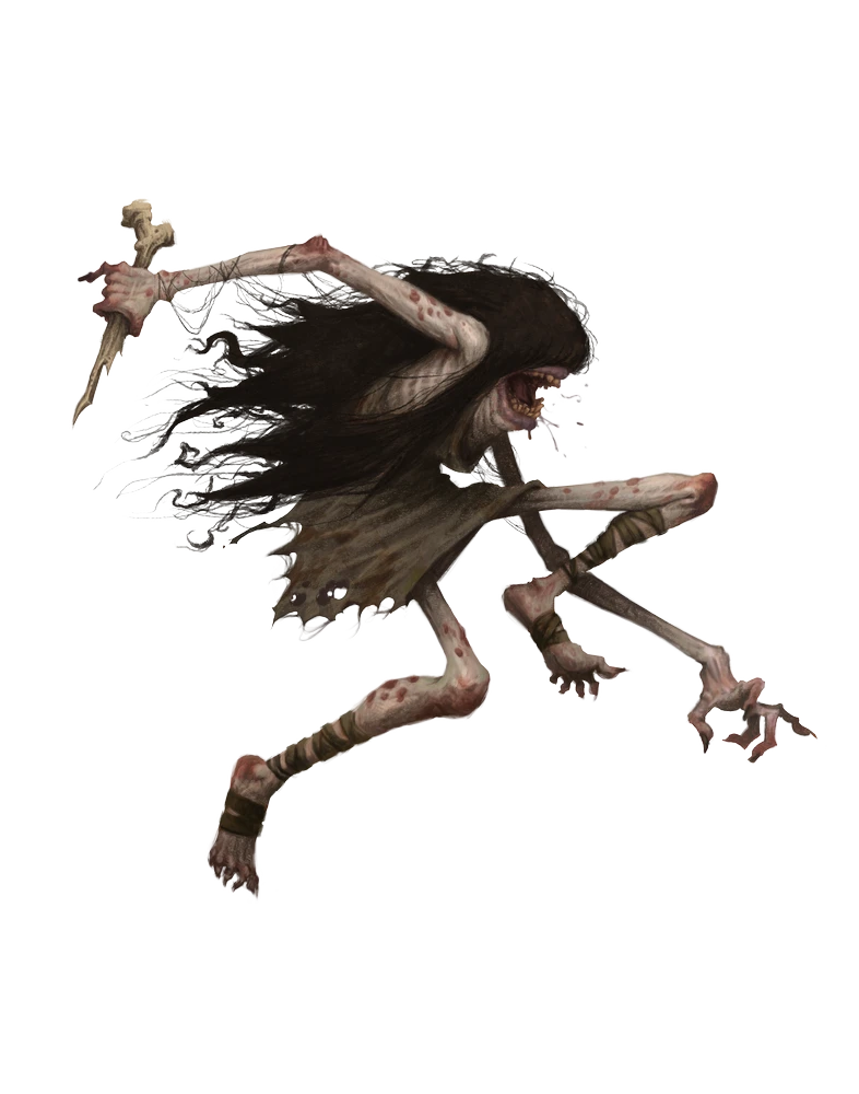 A meokdan's emaciated frame appears human in shape, with thick, tangled hair that grows directly from their face as well as the rest of their head, leaving only the meokdan's gaping mouth visible. Their arms appear to be broken and unnaturally long, with equally long fingers tipped with ragged nails. Small, open sores pockmark their skin.