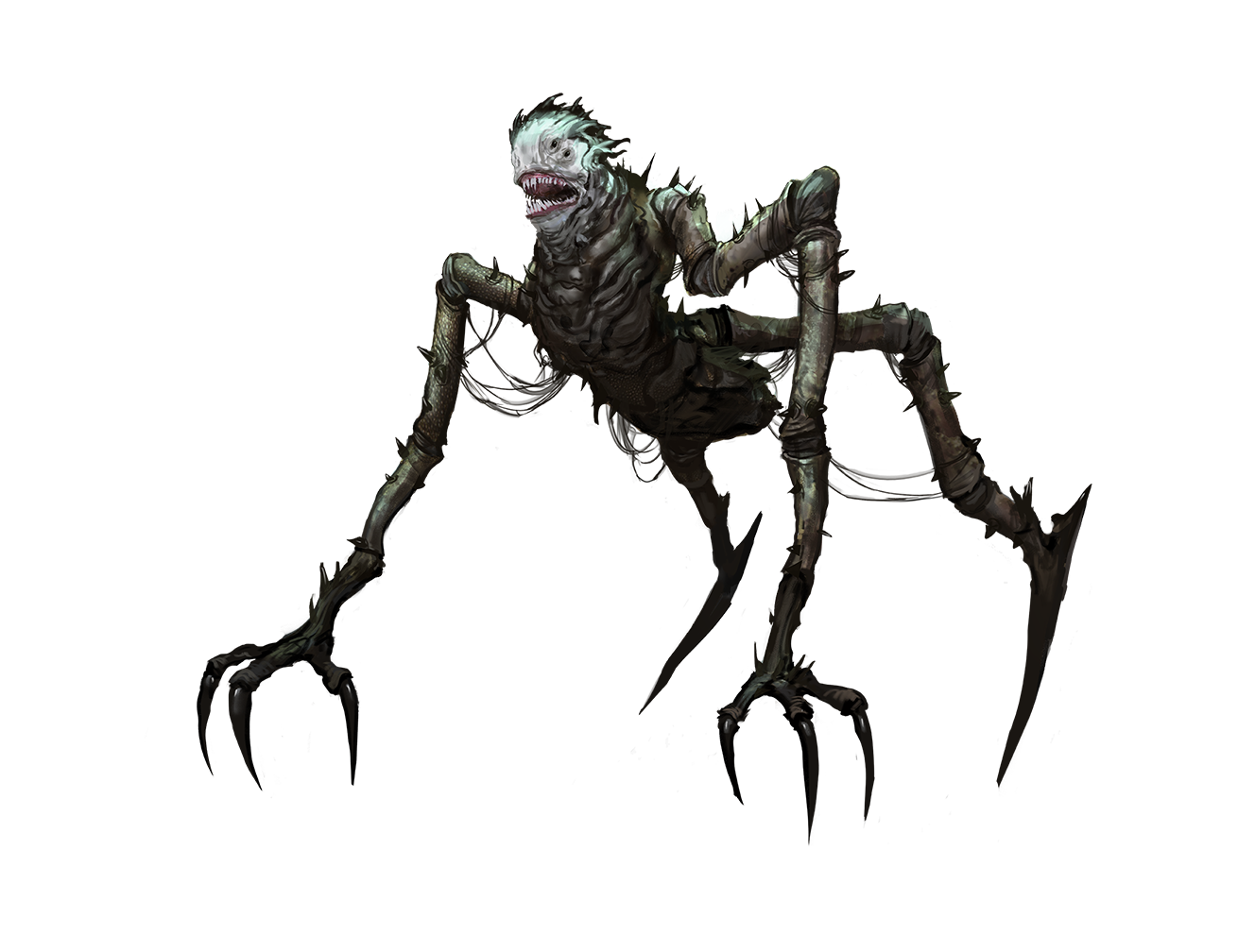 Quintessivores are cunning creatures that wield arcane magic and scalpel-sharp spider limbs that can rend one's soul just as easily as flesh. A quintessivore doesn't immediately kill its prey—it drags the creature to its lair and separates the victim's soul from their body with its bladed limbs. The flicking blades then pull out the creature's individuality, reducing the soul down to pure soul-stuff called quintessence, which the quintessivore then consumes.