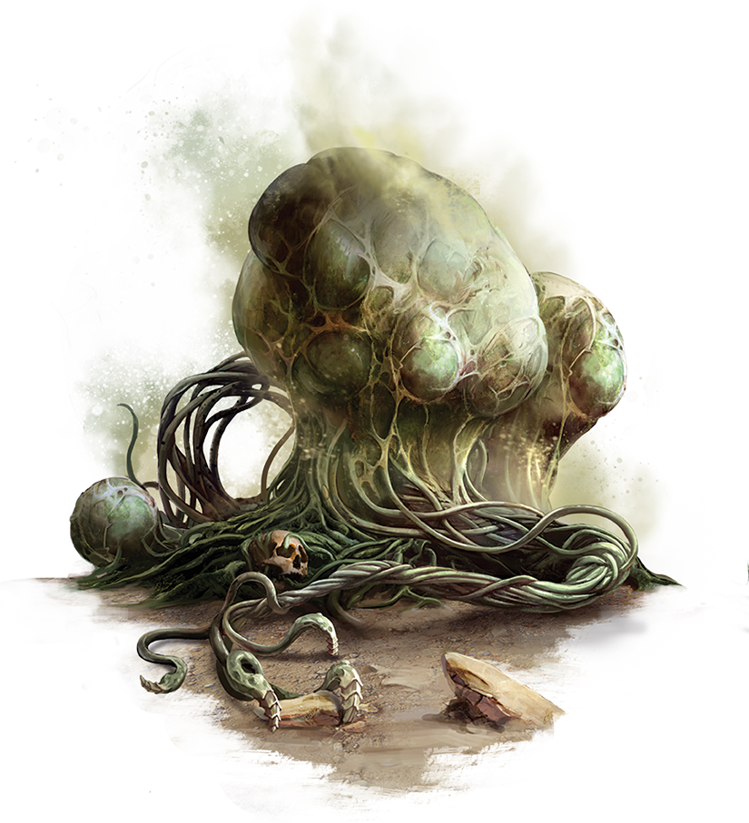 The drakauthix is a massive fungus that floats through the heights of the largest Darklands caverns, propelled by bladders that spray air and spores. A voracious but slow-moving hunter, the drakauthix prefers to ambush meaty creatures from above, using its hooked appendages to pull its victims upward to feed. The drakauthix’s digestive process is entirely external—it clings to victims, and its spore-laden surface slowly feeds on and grows through the flesh before the spore-infested carcass is discarded. As the infested body strikes the ground below, it bursts and releases a cloud of spores, unleashing a host of young called sporelings that immediately scuttle up the cavern walls to cling to its ceiling and grow.