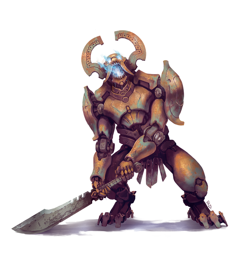 Most brass bastions prominently display the sigil of their owner or maker, though magical methods can also determine who crafted a specific construct. Brass bastions forged by favored artisans are a status symbol in many ifrit communities. Ifrits consider a brass bastion crafted by a non-ifrit to be inherently inferior, barely worth the cost of its materials. Brass bastions obey magical programming imprinted at the time of their creation or follow commands from their owners. Most can't speak, but a few have magical voices and can parrot simple phrases, recite poetry, or tell bedtime stories at the crafter's fancy.