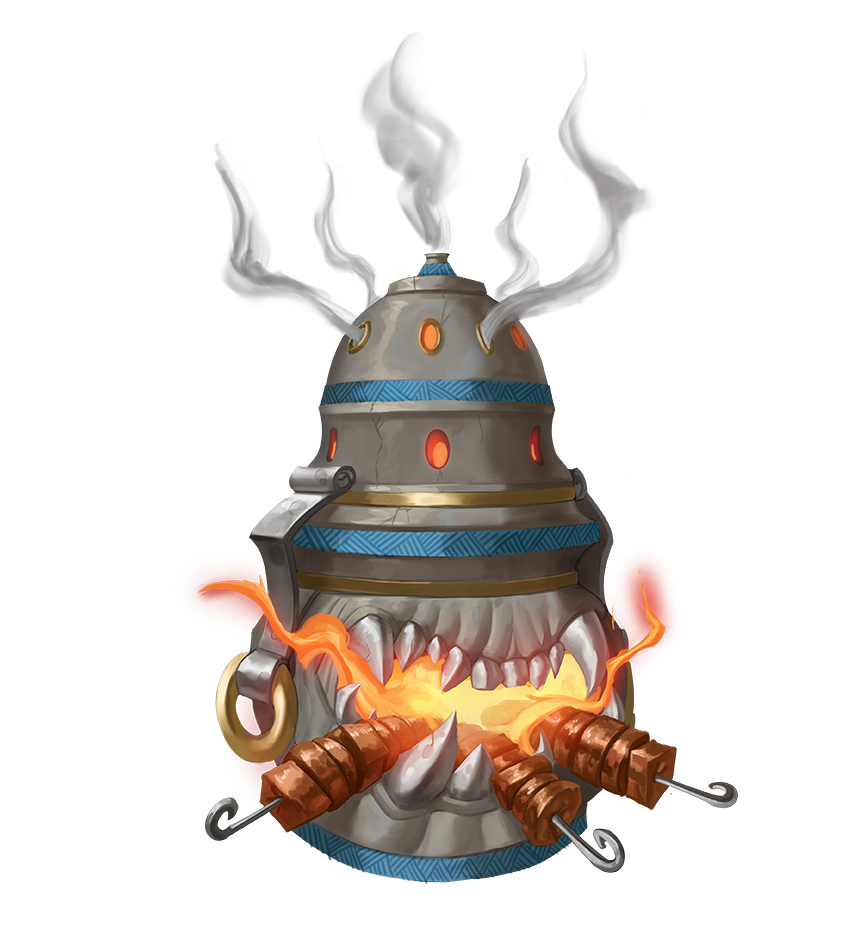 With bodies of fired clay, brochmaws look like walking cylindrical ovens split across the middle by their titular maws, which rage with the fires of culinary perfection. Behind their maw burns a powerful internal oven, where the elemental creatures roast their prey.