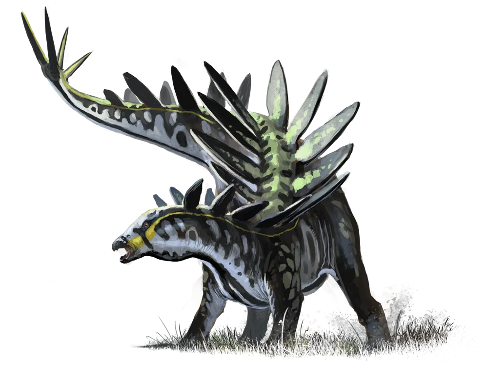 The stegosaurus is easily recognized by its twin rows of diamond-shaped dorsal plates that run down its spine and thick tail adorned with four large spikes. This configuration protects the herbivore, the plates deflecting attacks while it gores predators with its tail.