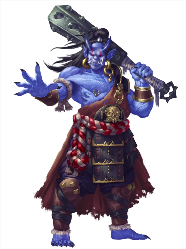 Mountain oni are the most common oni and often considered the least sophisticated. While other oni might have a stronger connection to the spiritual world, mountain oni have little interest in anything beyond satisfying their relentless appetites. Sloth and gluttony are common vices among mountain oni, which can allow them to coexist with nearby villages so long as they're well fed, but more ambitious mountain oni can often be found leading ogre war parties or orchestrating violent bandit raids. It's rare for mountain oni to live solitary existences, but those who do prefer to maraud the countryside or exploit villages and hoard the spoils for themselves.