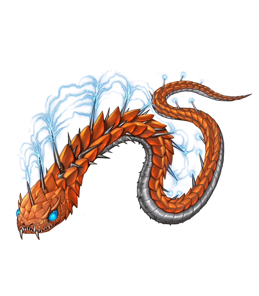 Storm snakes are reclusive creatures only seen in the wild during intense storms. The metallic scales that cover their bodies attract and absorb nearby lightning strikes, suffusing the creatures with a halo of blue or white light. Because storm snakes are most often sighted in solitude and disappear without a trace as soon as a storm recedes, a lot of folklore across Golarion considers them to be the emissaries of storm deities and harbingers of disaster.