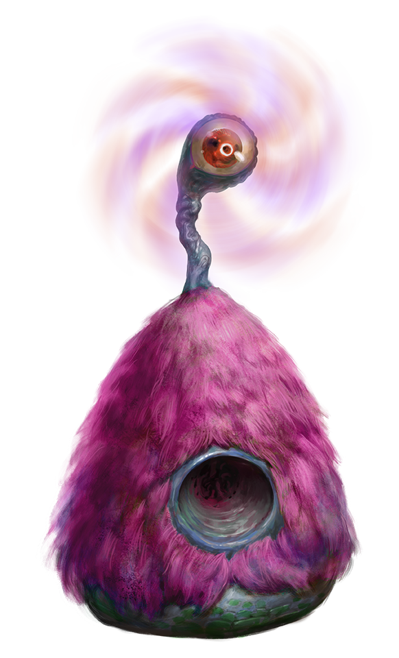 In their infancy, zuipnyrns are spherical and furry, with few features other than a single eye stalk and a round, toothless feeding hole. A zuipnyrn’s body is particularly soft and malleable, allowing it to withstand falls and other hazards. Its eye stalk has the ability to produce a blinding burst of light as a defensive measure, which allows a zuipnyrn just enough time to escape in times of danger. Even more incredibly, a zuipnyrn can emit a hypnotic aura from its eye to entrance those around it—an ability it uses to avoid conflict and to persuade bystanders into helping it escape perilous situations. As they age and grow, zuipnyrns adapt to their environment by growing additional limbs, sprouting additional sensory organs, developing gills, or otherwise altering their anatomy to suit the area.