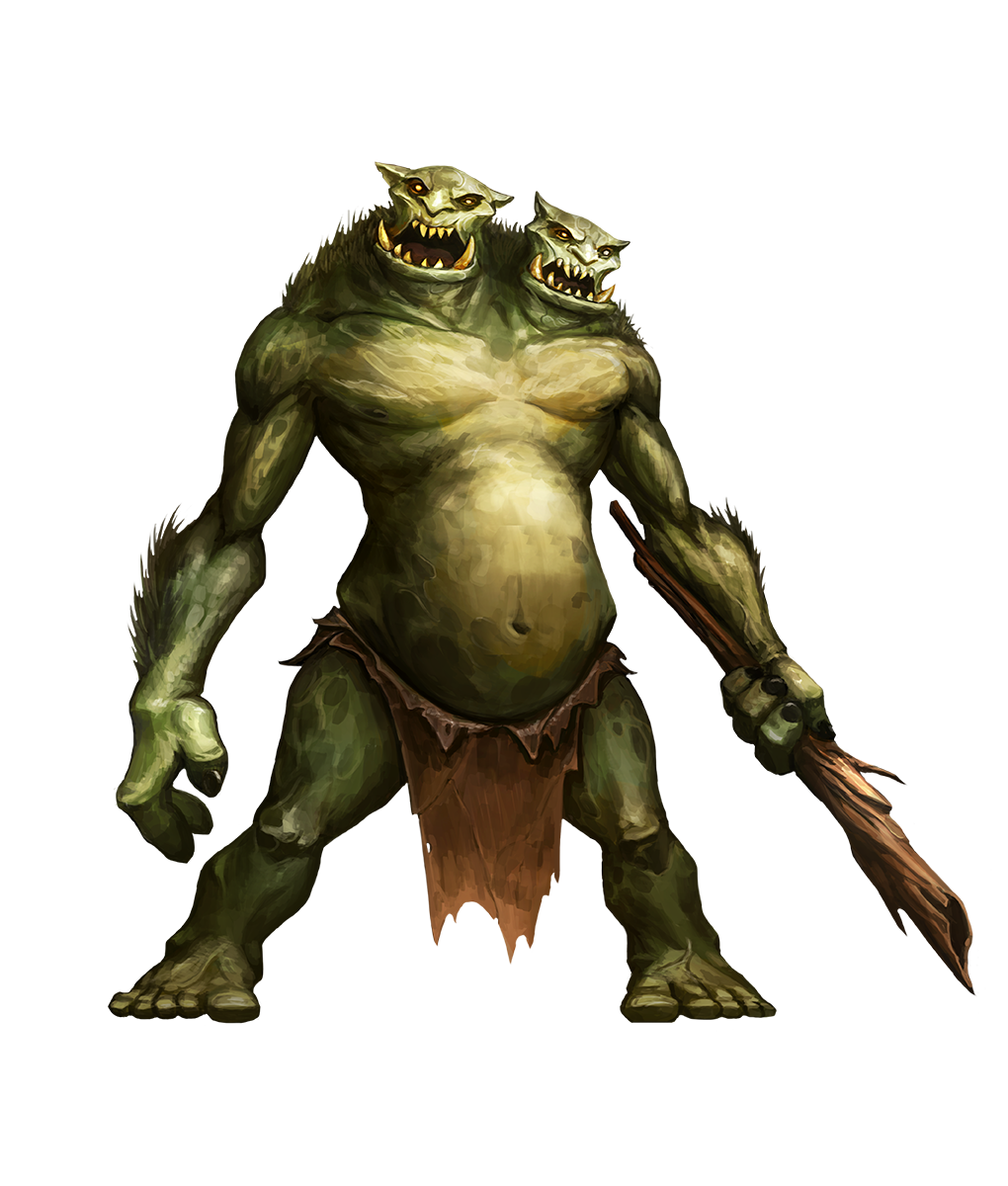 Two-headed trolls are savage, dual-minded monsters with an unquenchable thirst for bloodshed, and dread tales of their ravenous appetites are whispered of in homesteads throughout the lands of the Inner Sea. Indeed, it is a custom for parents to invoke the two-headed troll as a warning to misbehaving children. “Finish your chores,” a parent might say to a stubborn child, “or a two-headed troll will snatch you away at night and swallow you whole!” It's unclear why such a morbid tradition gained traction with parents, but it's an undeniable fact that two-headed trolls have an appetite for “nibbles”—creatures small enough to devour with one bite.
