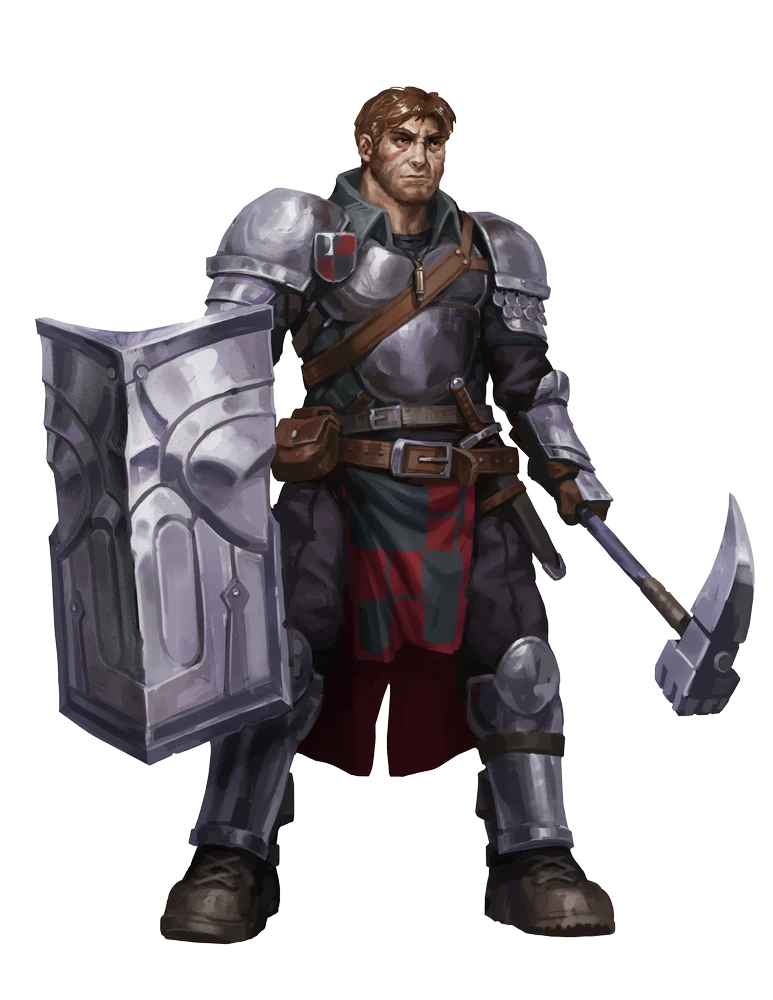 Items breastplate, crossbow (20 bolts), dagger, signal whistle, steel shield (Hardness 5, HP 20, BT 10), warhammer