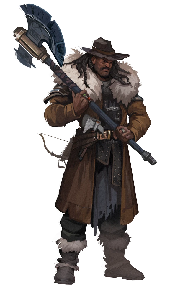 Melee [one-action] greataxe +27 [+22/+17] (magical, sweep), Damage 2d12+13 slashing plus hunter's precisionMelee [one-action] fist +26 [+22/+18] (agile, nonlethal, unarmed), Damage 1d4+13 bludgeoning plus hunter's precisionRanged [one-action] hand crossbow +26 [+21/+16] (magical, range increment 60 feet, reload 1), Damage 2d6+8 piercing plus hunter's precisionDeadly Snares [three-actions] (manipulate) The hero hunter Crafts a snare that would normally take 1 minute or less to Craft. The Stealth DC to locate the snare and DC to disable it with Thievery are equal to the hero hunter's Crafting DC if it's higher than the snare's DC.Felling Shot [one-action] The hero hunter makes a ranged Strike. If it hits and deals damage to a flying target, the target falls up to 120 feet but takes no damage from the fall. The creature can't Fly, Leap, levitate or otherwise leave the ground until the end of the hero hunter's next turn.Hunter's Precision [one-action] (stance) The hero hunter knows how to hunt and kill any game. While in this stance, all the hero hunter's Strikes deal an additional 2d8 precision damage, and the range increment for their ranged weapon Strikes is 20 feet longer than normal. If the hunter gets a critical hit with a weapon Strike, the target also takes 2d6 persistent bleed damage.