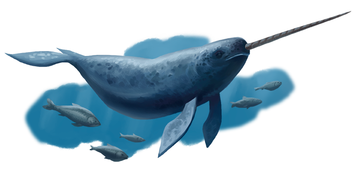 Narwhals are mid-sized whales known for the long tusk that grows from their nose. The tusk, forming from a protruding canine tooth, appears primarily on males and can grow up to 10 feet in length over the course of an adult narwhal's life. In addition to helping the narwhal attract mates (much like a peacock's feathers), the tusk can serve as a weapon.