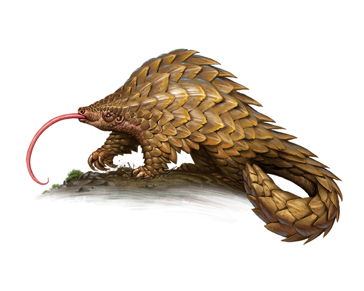 Despite their prodigious size, giant pangolins are solitary, reclusive creatures who forage by night for insects and vermin. To defend themselves from predators, they rely on a veritable arsenal of natural defenses to dissuade their foes: thick armor of wickedly sharp scales, a flexible and muscular body capable of rolling into a defensive ball, and a noxious musk. Against more persistent threats, giant pangolins' powerful digging claws prove mighty weapons in a pinch.