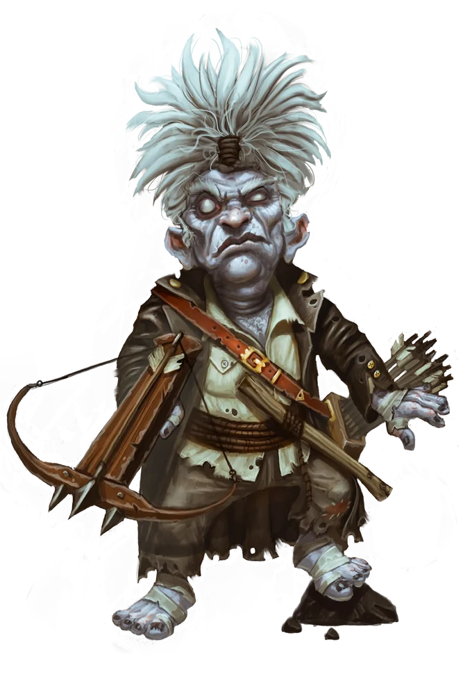 Deros are short, wiry humanoids with milky white eyes, gray-blue skin, and wild shocks of off-white or gray hair. The descendants of a mysterious type of fey abandoned in the deepest, darkest caverns of Golarion, deros are the subject of fearful legends and folk tales to most of the world's surface races. They skulk beneath major metropolitan areas, performing cruel and twisted experiments on unwilling subjects.