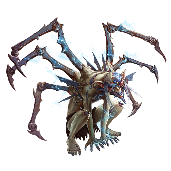 Though most dreshkans fire electrified needles from the metal limbs on their backs, some are built with even stranger abilities. Seugathi masters looking to perfect their craft will sometimes “upgrade” dreshkans' artificial limbs to gout steam, hammer through stone, or launch hooks at the end of long cables.