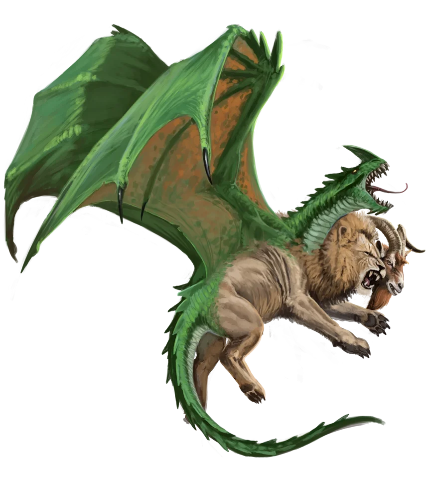 The chimera is the archetypal example of an unnatural monster made up of a monstrous mix of wildly different component creatures: in this case, a lion, a dragon, and a goat. Wild, hateful, and hungry, it tries to eat any creature it sees, but sometimes a strong-willed master is able to compel a chimera to serve as a guardian or even a mount. If such an individual ever loses their control over the chimera, they are often the first to be devoured.