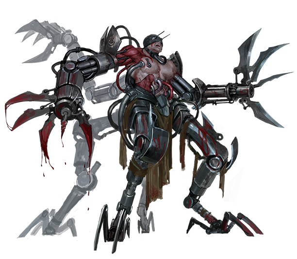 Interlocutors are the most talented surgeon-sculptors of the velstracs, carving away flesh and replacing it with new body parts of muscle, sinew, and metal. Few interlocutors resemble one another, but all are towering, multi-limbed amalgamations of the strongest limbs, densest bone, and sharpest metal they can find. They continually search for new material to graft to their forms, and their slain foes are rarely found intact, as little is more valuable to interlocutors than a powerful opponent’s legs, eyes, or even brain.