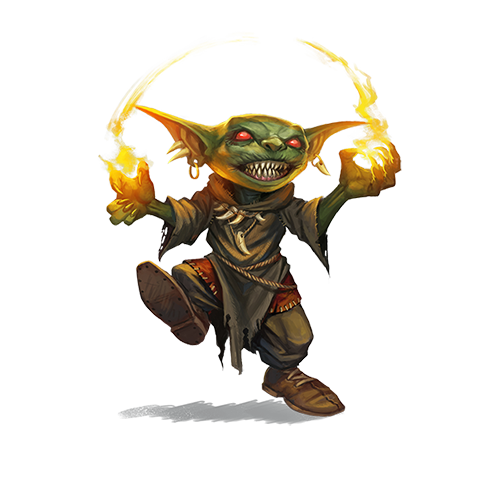 Goblins are superstitious, with an intense awe of magic and a fascination with fire; goblins who master magic or fire earn great respect from their kin. Most other humanoids find it difficult to understand goblins’ outlook: they hate canines but eagerly share their lairs with so-called “goblin dogs,” they fearlessly attack larger creatures but are terrified of horses, and they despise vegetables yet consider pickles a delicacy. To a goblin, of course, these are all perfectly sensible life choices.