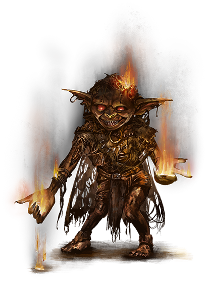 Goblin mortics have blackened, charred flesh and smoldering burns all over their body, as if they'd been burned alive. They are highly flammable but inured to the pain, and they enjoy lighting themselves (and everything else) on fire.