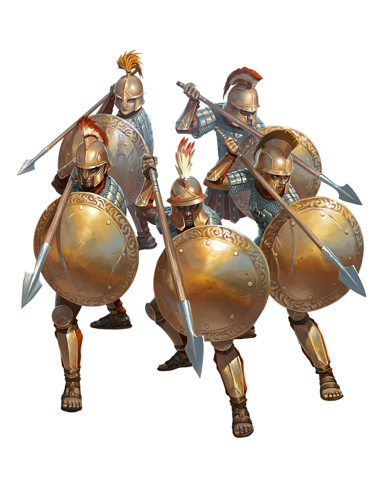 Hurl Javelins [two-actions] The troop's members throw a volley of spears. Each creature in a 10-foot burst within 30 feet of the troop takes 2d6+5 piercing damage with a DC 23 basic Reflex save. When the phalanx formation is reduced to 2 or fewer segments, this area decreases to a 5-foot burst.Spears Out! [one-action] to [three-actions] Frequency once per round; Effect The phalanx formation thrusts their longspears out in all directions, striking all unfortunate enough to be near them. Each enemy in a 10-foot emanation must attempt a DC 23 basic Reflex save. The damage depends on the number of actions.