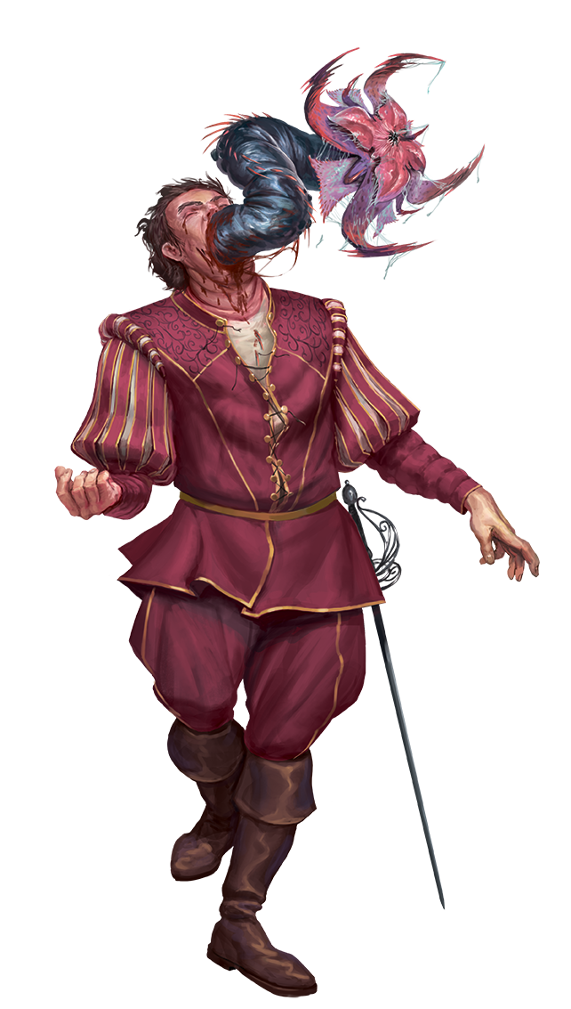In its natural form, a vermlek resembles an oversized pinkish worm with four long tails that end in writhing fibrils. Its mouth splits into four segments like a profane tulip lined with rows of dozens of pointed teeth. More often than not, however, these fiends are encountered only after they have crawled into the body of a dead humanoid and made the hollowed-out flesh their temporary host. Vermleks use their powers of deception and disguise to infiltrate mortal settlements and influence unwitting acquaintances of the bodies they wear. Particularly intelligent or conniving vermleks might even reach stations of real power within the ranks of an army or government, at which point exposure of their true form can wreak havoc among the populace they have so thoroughly duped.