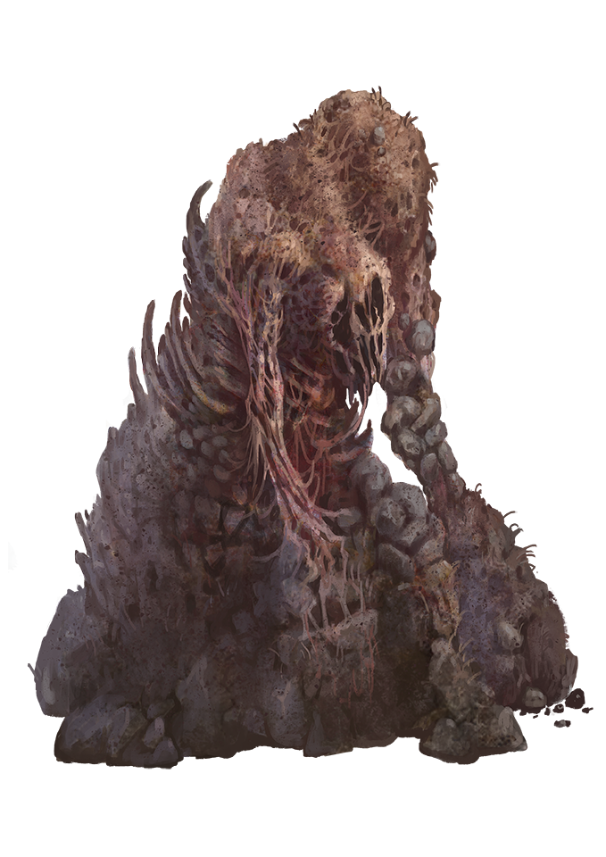 Break Ground [two-actions] (arcane, earth, transmutation) The guecubu stomps, and the ground breaks and ripples in a 30-foot emanation, erupting in razor-sharp, crisscrossing spikes of rock that deal 3d8 piercing damage to creatures in the area (DC 26 basic Reflex save). The area becomes difficult terrain and hazardous terrain, with each square dealing 3 piercing damage to a creature that moves through it. A guecubu is immune to these effects. Ground under the effects of a consecrate ritual or a circle of protection spell tuned against evil or chaos can't be affected by this ability.Earth Glide The guecubu can Burrow through any earthen matter, including rock. When it does so, the guecubu moves at its full burrow Speed, leaving no tunnels or signs of its passing.Shove into Stone (arcane, earth, transmutation) When the guecubu successfully Shoves a creature into a stone barrier, the target must succeed at a DC 26 Reflex save or become merged with the barrier, with the effects of meld into stone until the target Escapes (DC 26).Wrathful Misfortune (arcane, curse, enchantment) A creature damaged by a guecubu must succeed at a DC 26 Will save or become cursed with consummate bad luck. The creature becomes clumsy 2. Each time that creature rolls initiative, on their next roll they must roll twice and use the worse result; this is a misfortune effect.