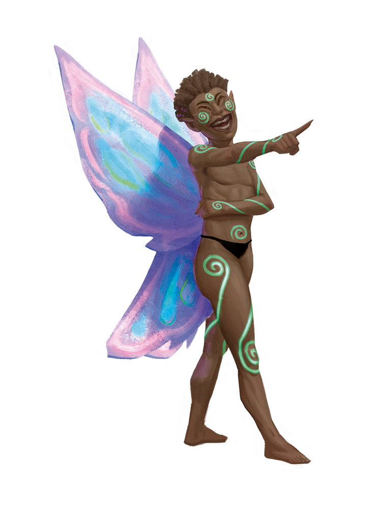 Elusive, flighty, and ebullient, sprites are what many villagers first imagine when they hear the terms “fey” or “fairy.” While their dispositions vary from the benevolent grig to the trickster pixie, all sprites share a connection to magic and diminutive size. This family of fey shares its name with its slightest and most populous member, the common sprite.