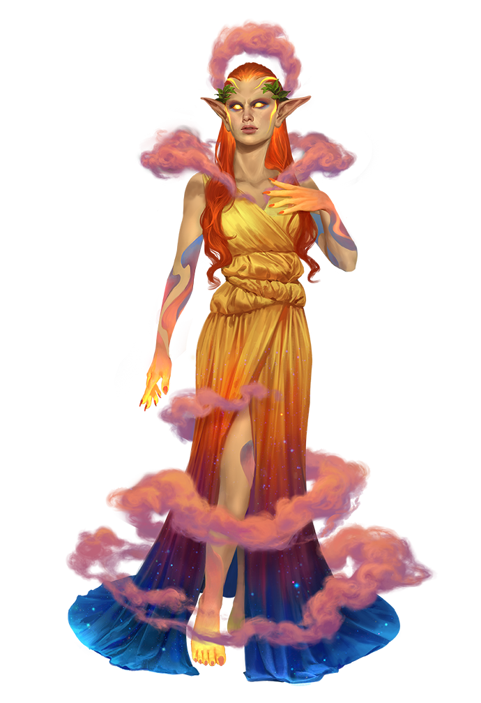 Hesperides are nymphs of sunset, guardians of the colorful golden hues of the setting sun. They live on remote islands, isolated coastal cliffsides, and hidden valleys, all places where the sunset's golden glow can have the strongest effect. Hesperides manipulate sunlight with dancelike motions, allowing them to create graceful ribbons of light at close range and searing rays at a distance. Due to their connection to the beauty of the daily cycle of the setting sun, hesperides feel a satisfaction from methodical routine that can feel alien to wilder, more chaotic fey.
