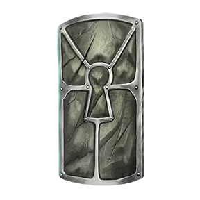 An image of a keyhole adorns the coat of arms of this stone tower shield (Hardness 10, HP 40, BT 20).