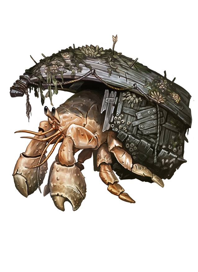 Lucky hermit crabs with plentiful resources can live for decades and grow to tremendous sizes, often with magical help. Too large for most natural shells, giant hermit crabs use a variety of debris instead, including wagons, boats, treasure chests, and even abandoned pieces of giant armor.