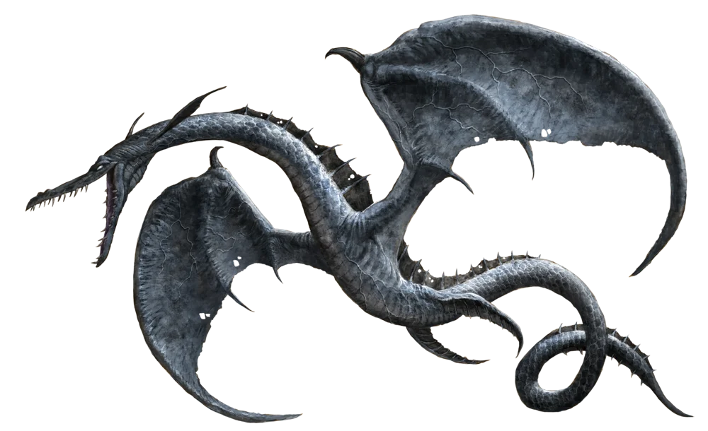 Although the glistening scales and sleek, fin-like wings on these drakes give them an appearance reminiscent of river fish, they are actually distant relatives of the dragons that rule the oceans. While smaller than most drakes, river drakes are more than capable of plaguing river travelers and are equally at home above and below the water's surface. This flexibility allows them to catch a wide variety of prey, from fish and boggards to deer and the occasional ferry passenger.