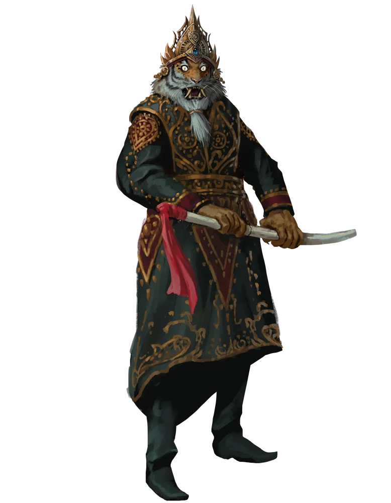 The most iconic rakshasas, raja-krodhas are tiger-headed hunters of mortalkind. They are incarnations of all the malice people try to deny within themselves and instead wrongly ascribe to deadly predators of the wild. Their power and skill inspire fear, but also awe, and it is not unknown for some peoples to treat such a rakshasa as a guardian, if one to be treated with extreme caution.