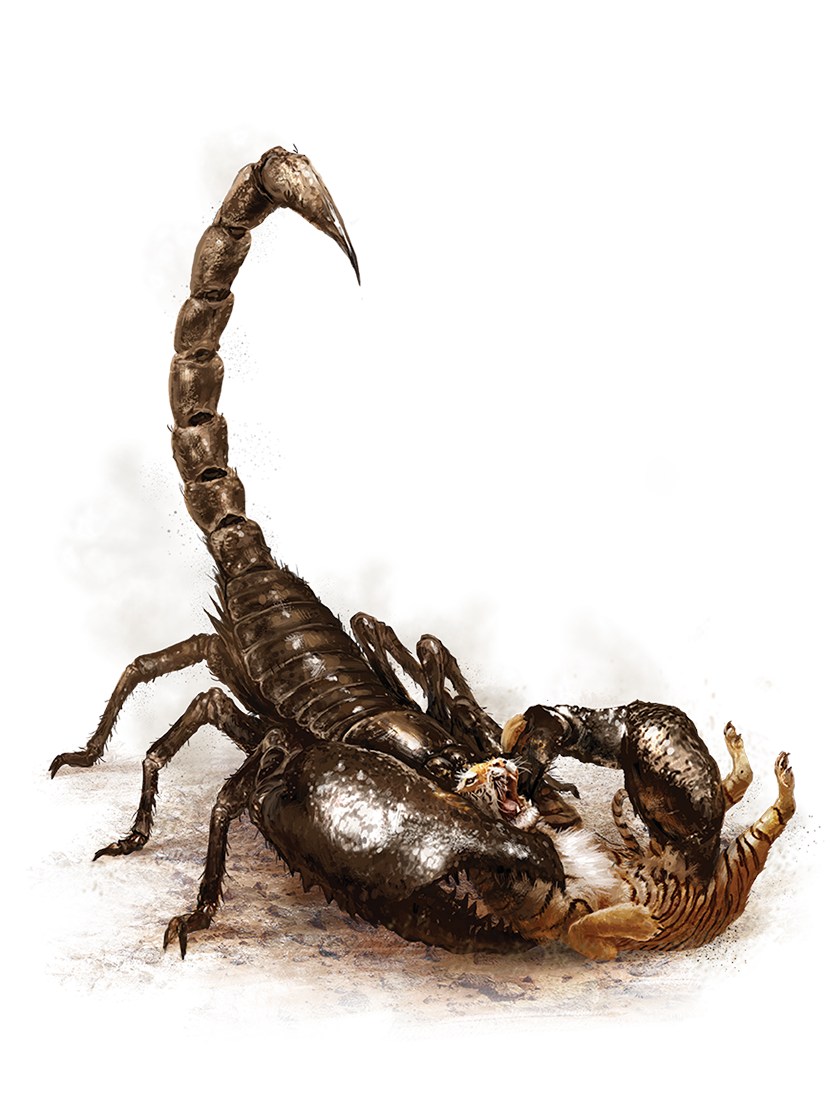 Chitinous scourges of deserts, forests, savannas, and badlands, scorpions are deadly arachnids with powerful pincers and a painful sting. Scorpions can be found in nearly every climate, where they hunt their prey with a mixture of patient stealth and raw strength. Most scorpions live in underground burrows, either as lone hunters or part of a larger colony. These arachnids are so feared and dangerous that in many cultures, they are treated as deities or dualistic symbols of both death and protection from said death.