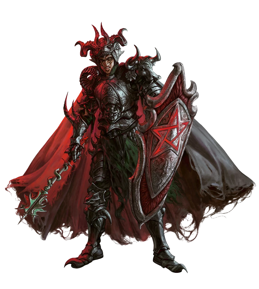 Zealots ferret out plots against their religion and seek justice for their church's followers. This zealot serves Asmodeus, but others might serve Abadar, Calistria, Iomedae, Norgorber, Pharasma, Sarenrae, or Zon-Kuthon. They often ride a war horse (Monster Core 201) wearing light barding. To depict a zealot's mount, add this horse to the encounter as an additional monster with its own actions, adjusting the encounter's XP budget accordingly.