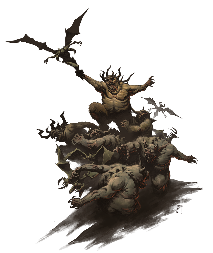 Demons are legion. Countless examples crowd the Abyss, many of which have yet to be categorized by mortal scholars. In the Abyss, might very much makes right, and so despite their chaotic nature, weaker demons often gather together to enjoy safety in numbers.
