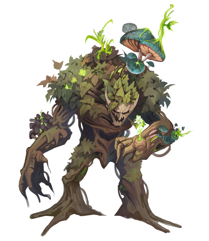 Zibik shepherds death, and life follows.” A common greeting among Zibik's followers, this saying encompasses many aspects of the green man's life and teachings. While typical green men concern themselves entirely with the wellbeing of plants, Zibik focuses on the persistent collapse and decomposition that allows environments to thrive. In many ways, he's the embodiment of a towering tree falling over, the loss of its expansive canopy allowing sunlight to reach a new generation of saplings. Fungus fascinates Zibik, and his long association with decay and regrowth has caused him to take on aspects of primal fungus.